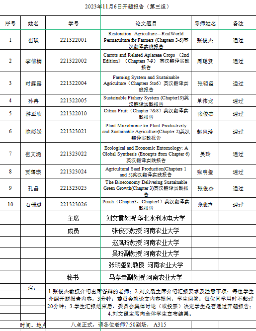 本网讯(审稿:张俊杰 供稿:陈昱)2023年11月5日至6日,成人频道 在繁塔楼A315、A320和A324教室顺利举行2022级英语笔译研究生毕业论文开题报告会。此次开题报告会特邀河南师范大学赵文静教授、华北水利水电大学刘文霞教授与李胜机教授担任委员会主席,全体硕士生导师担任委员。共有31名研究生参与本次毕业论文开题报告会,分为三个小组展开答辩。2023级研究生观摩旁听。