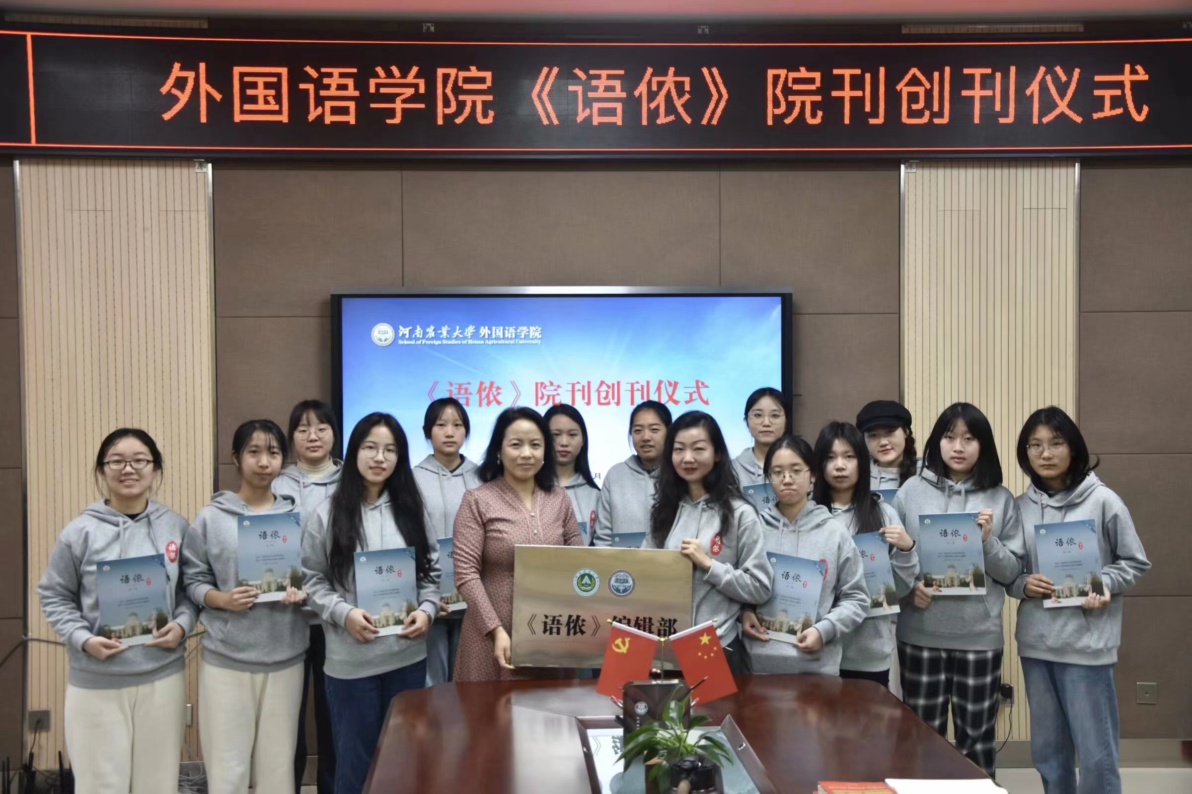 王燕萍向《语侬》编辑部授牌并向编辑部全体成员发放了首期院刊。她为院刊《语侬》的成功创办表示非常欣慰与高兴,向全体为《语侬》付出辛勤努力和劳动的老师和同学们表示感谢。她指出,习近平总书记多次强调要“着力提高国际传播影响力、中华文化感召力、中国形象亲和力、中国话语说服力、国际舆论引导力,不断提高塑造国家形象、影响国际舆论场、掌握国际话语权的能力和水平。”《语侬》是我们农大外语学子在创新对外话语体系的一个重要的载体。希望全院师生用温暖把《语侬》宣传出去、带着责任把《语侬》办好、带着爱心把《语侬》传递下去,稳定发挥,持续发力,向更多的人展现农大成人频道