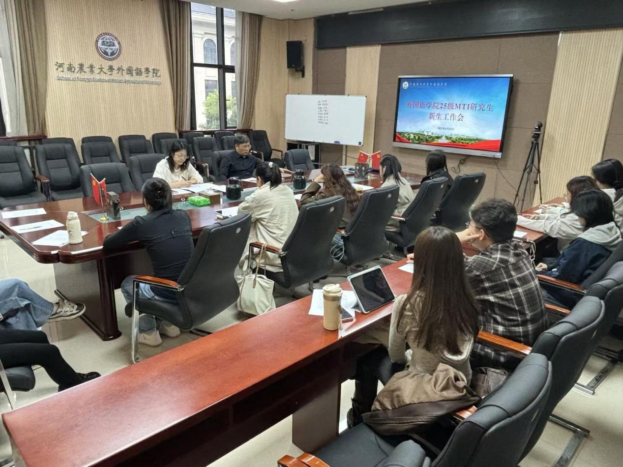 于A320会议室召开英语笔译专业研究生新生工作会。院长张俊杰出席,学院MTI研究生全体新生参加,会议由研究生辅导员薛杰主持。
