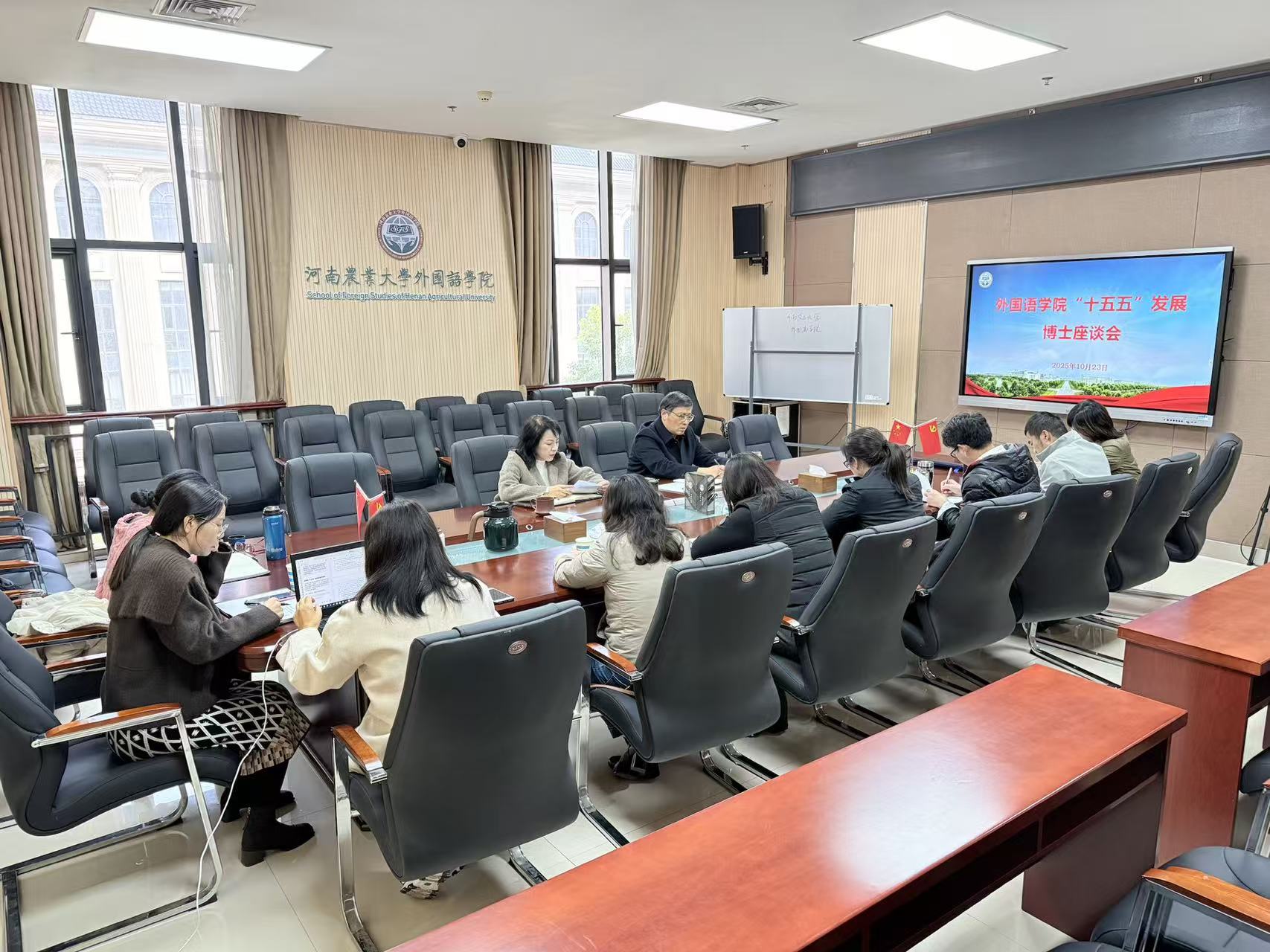 座谈会上,气氛热烈,发言踊跃。博士教师们结合学习校党委书记岳杰勇署名文章《以农业高校综合优势助力农业强省建设》体会感悟和自身教学科研实践,从教育教学改革、学科专业建设、科学研究、人才培养、社会服务等多个维度为学院未来发展积极建言献策,提出了诸多具有前瞻性的建议和意见。在学科建设与科研创新方面,大家充分认识到要进一步凝练学科方向,整合现有资源,力争在外语学科与农科的交叉融合领域形成特色优势,培育新的学科增长点。在人才培养与教学质量提升方面,建议优化本硕博课程体系,将前沿研究成果融入教学,培养学生的跨文化能力、批判性思维与创新能力;积极贯彻落实全员导师制,增强学生的专业自信和专业认同,提升学生的综合素质与就业竞争力。在社会服务和加强国际传播方面,建议依托河南省中原农耕文明国际传播中心,进一步深入挖掘中原农耕文明的历史内涵和时代价值,创新传播方式,用外语讲好更多的农大故事、河南故事、中原农耕文明故事。