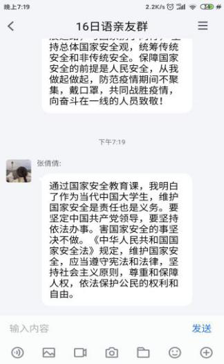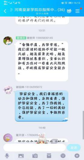 开展了网上“国家安全知识试卷”答题活动,组织学生集体学习国家安全知识,系统了解总体国家安全观的主要内容。随后,学院组织各支部团员认真观看“千万学生同上一堂国家安全教育课”,使其集中学习国家安全观理论知识。并开展主题团日活动,进一步拓展学习成果。与此同时,学校利用官方微博、官方微信公众号等宣传平台,发布推送国家安全知识和相关法律法规内容,营造了浓厚的安全教育氛围。同学们纷纷表示,作为新时代的团员青年,将以身作则,自觉遵守相关法律规定,不做有危害祖国安全、荣誉和利益的行为,竭尽全力维护国家安全。