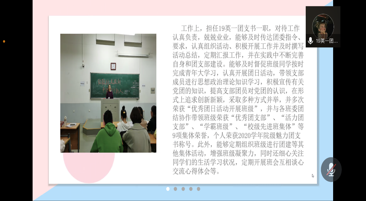 本次评选分为活力团支部评选和魅力团支书评选两个环节。在活力团支部评选环节,各团支部主要从思想引领、学风建设、工作开展、社会实践、及未来规划等方面进行展示。其中,19级英语二班班长张帆頔以工作特色与亮为切入点,分享了19英语二班团支部的独特风采。在支部活动方面,19级英语二班团支部积极组织开展主题班会、团日活动,参加各项文体活动和公益活动。通过团结协作、努力拼搏取得了优异的成绩。
