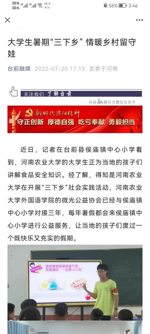 本网讯(审稿:陈桃 供稿:张仪婷)为深入了解农村发展现状,促进农村文艺发展,关爱留守儿童,2022年7月10日,由成人频道 微光公益协会以及机电工程学院心农协会联合组织的“三下乡”社会实践队伍“云飞风起掷台前”实践队前往濮阳市台前县侯庙镇中心小学开展三下乡社会实践活动。