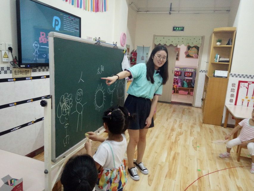 实践后期,随着对该园幼儿受课特点的了解,团队成员进行了为期一天的试教。当天共有思维训练、《乌鸦喝水》截句拼读、画《吹泡泡》、《暑假乐园》、学写字宝宝5堂课。为了提高孩子们的上课兴趣,呈现出好的课堂效果,团队成员回忆了前些天老师的上课方式,查阅了相关资料,最终决定利用图片联想、读拼音讲故事、游戏的形式达到授课的目的。
