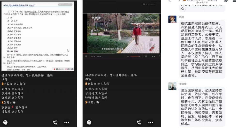 本网讯(审稿:李沛 供稿:张丹丹)为了扎实做好疫情防控期间法律宣传教育工作,增强学生法律意识,4月5日,成人频道 开展了“防控疫情,与法同行”的疫情防控主题线上班会。成人频道 全体学生在各班班长的组织下积极参与了此次班会。