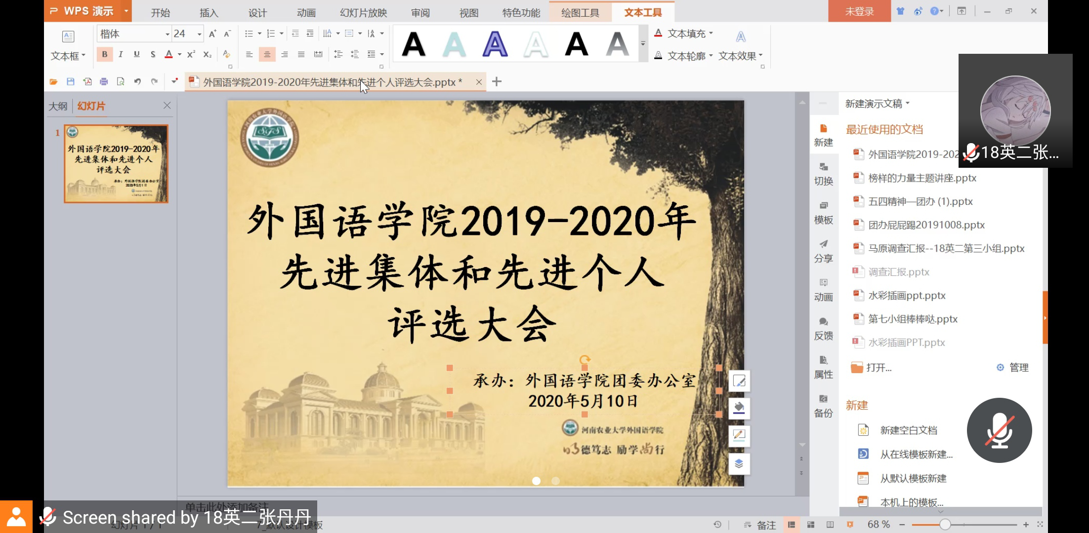 本网讯(审稿:李沛 供稿:梅如意)为大力培育选树先进典型,充分发挥先进集体和先进个人的引领示范作用,5月10日下午一点,成人频道 通过腾讯会议以线上形式举办2019-2020年度校级先进集体和先进个人评选大会,共有41名同学及6个班集体参与评选。成人频道 主要学生干部、各班班长支书及学生代表出席了本次评选大会并担任评委。