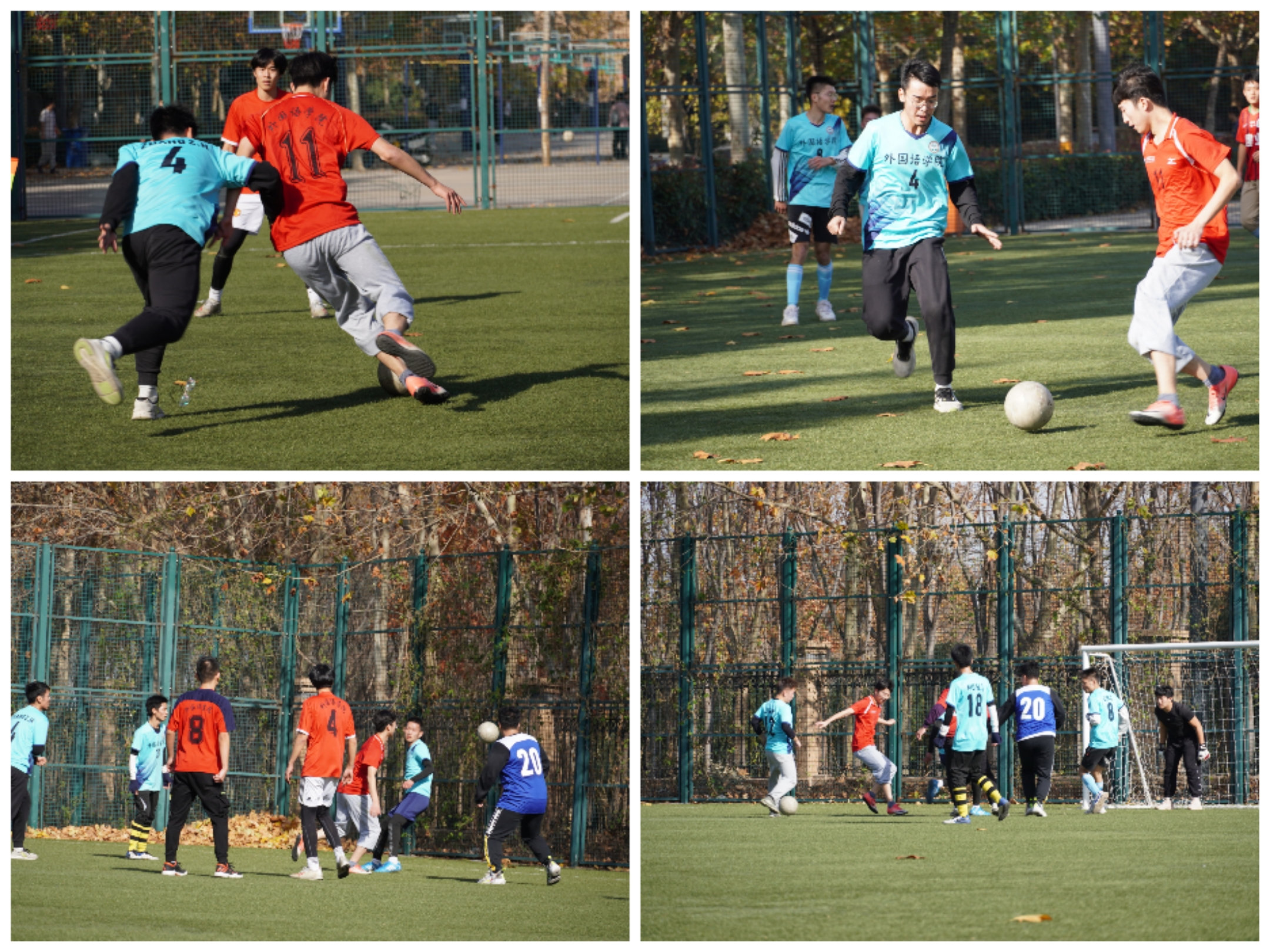 随着裁判的一声哨响,“外语杯足球赛”正式拉开帷幕。在观众的加油声中,双方队员很快进入了状态。上半场比赛双方都有来有往,形势陷入胶着。球员们以精湛的脚法,犀利的射门,引来观众的阵阵喝彩。无论是红队队员凌冽的攻势,还是蓝队队员大胆的试探,都让人紧张万分。中场休息过后,双方交换场地,开始下半场的激战。赛场上弥漫着紧张刺激的氛围,队员们默契配合、及时回防,你追我赶,不相上下。比赛接近尾声,蓝方球员利用红方的防守失误,再次进球反超比分。最后随着裁判一声哨响,蓝队和红队的比分定格在了2:1,蓝队取得最终胜利。比赛结束后,双方队员进行了友好的握手并互相致意。至此,“外语杯足球赛”圆满结束。