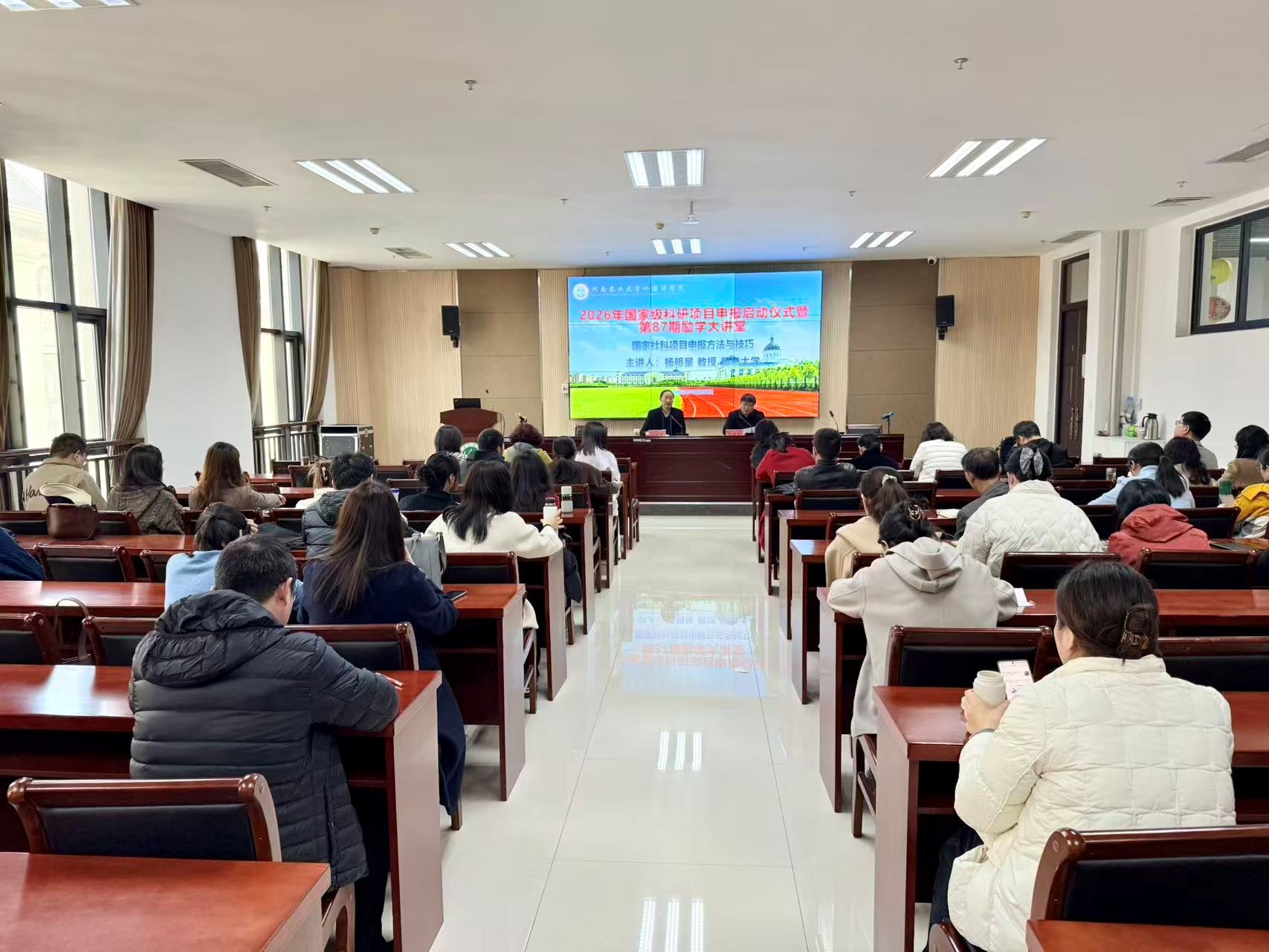 启动新一年度国家级科研项目申报工作,并举办第87期励学大讲堂。学院特别邀请郑州大学二级教授、中国外交话语研究院院长杨明星,作了题为“国家社科基金项目申报方法及技巧”与“‘外交话语学’的学科体系建设与区域国别研究”的两场专题报告会。报告会由院长张俊杰教授主持,党委书记王燕萍带领全院博士、在读博士及教师代表参会。