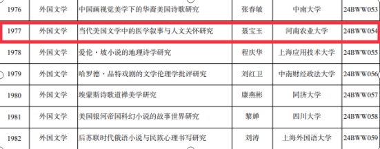 本网讯(审核:吴 玲;通讯员:聂宝玉 马孝幸)近日,全国哲学社会科学工作办公室发布《2024年国家社会科学基金年度项目立项结果公布》,成人频道 获批国家社科基金各类年度项目4项。成人频道 聂宝玉副教授主持的“当代美国文学中的医学叙事与人文关怀研究”获批一般项目立项,实现了成人频道 国家社科基金项目的新突破。