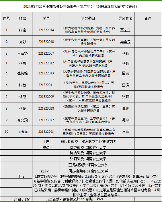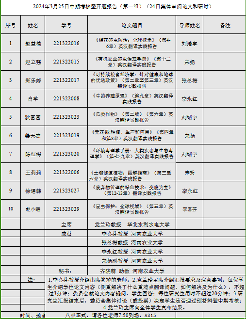 2024年英语笔译专业研究生中期考核暨学位论文预答辩于3月25日顺利举行。此次答辩分为三个小组,特邀华北水利水电大学党兰玲教授、河南财经政法大学孙建华教授与郑州航空工业管理学院郭银铃教授分别担任委员会主席,安阳学院校长单伟龙教授与学院全体硕士生导师担任委员,2023年新晋硕士生导师旁听观摩学习。共有29名研究生参与本次中期考核暨预答辩。2023级研究生观摩旁听。