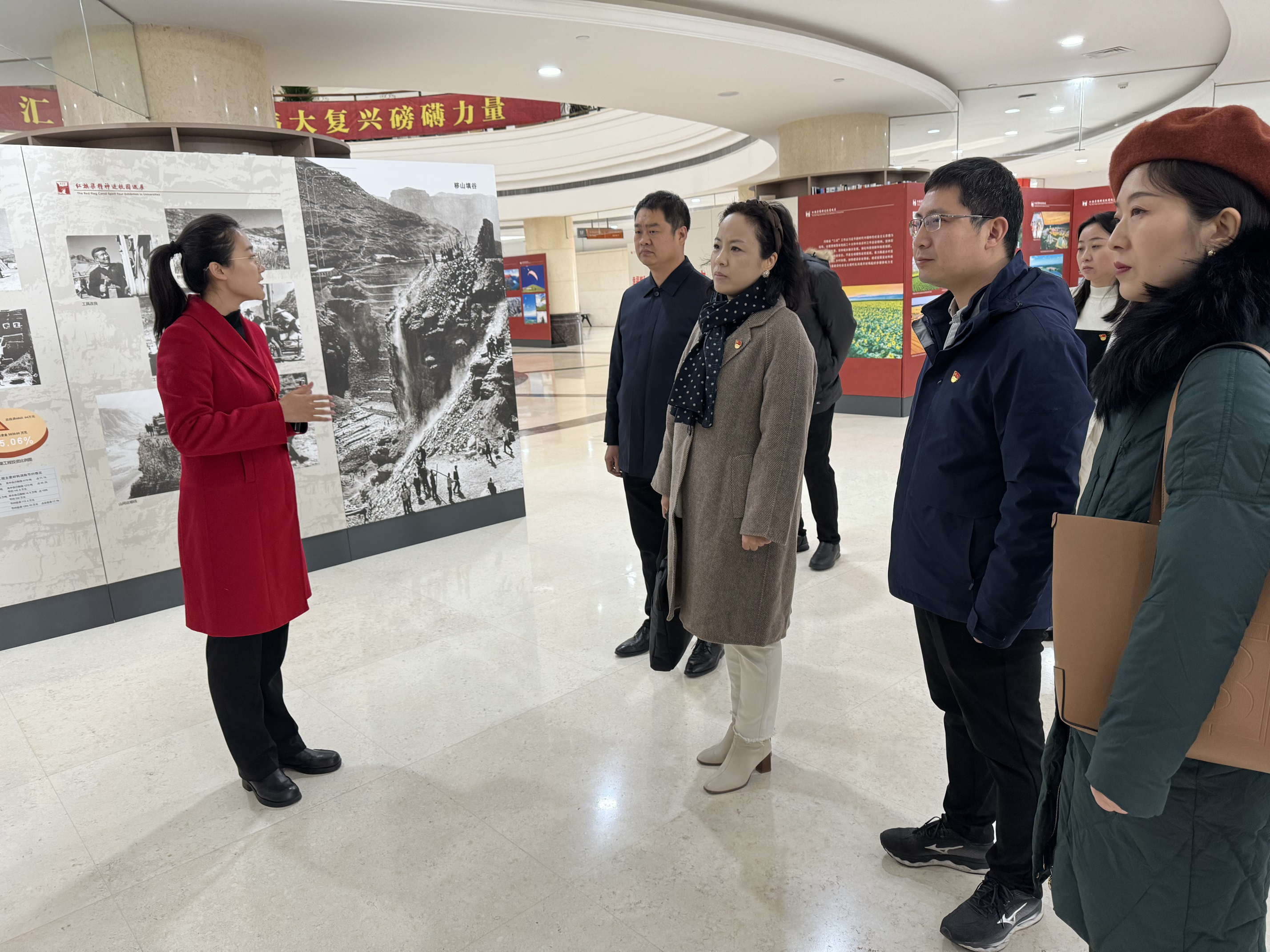 本网讯(审稿:王启佩 供稿:冯超 许菲)为深入学习宣传贯彻习近平新时代中国特色社会主义思想和党的二十大精神,弘扬革命精神,赓续红色血脉。12月1日,成人频道 党委书记王燕萍携院领导班子成员、大学生创新创业青年导师工作室教师代表、学生代表参观“红旗渠精神进校园巡展”。