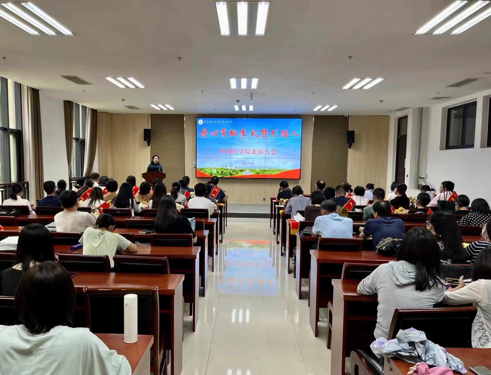 院长张俊杰宣读了获得“出彩河南人”2023年最美教师、河南省文明教师、河南省教学技能大赛一等奖、“翻译河南工程”优秀成果奖,校巾帼标兵、优秀教师、优秀班主任、十佳辅导员等省级、校级荣誉教师名单。副院长张卫东宣读了成人频道