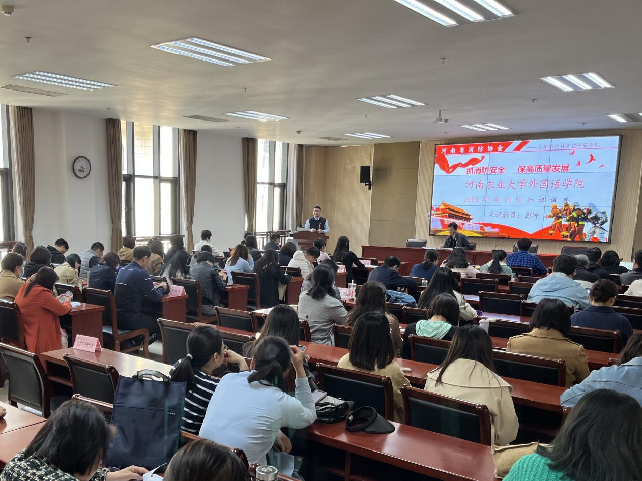 邀请河南省消防协会义务消防科教员彭冲作消防安全知识讲座。讲座在繁塔楼A324进行,副院长张卫东主持,全体教职工和部分学生代表参加。