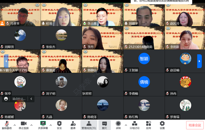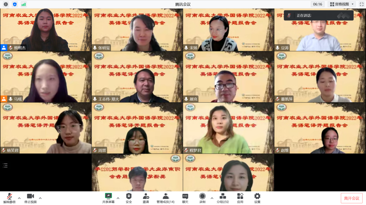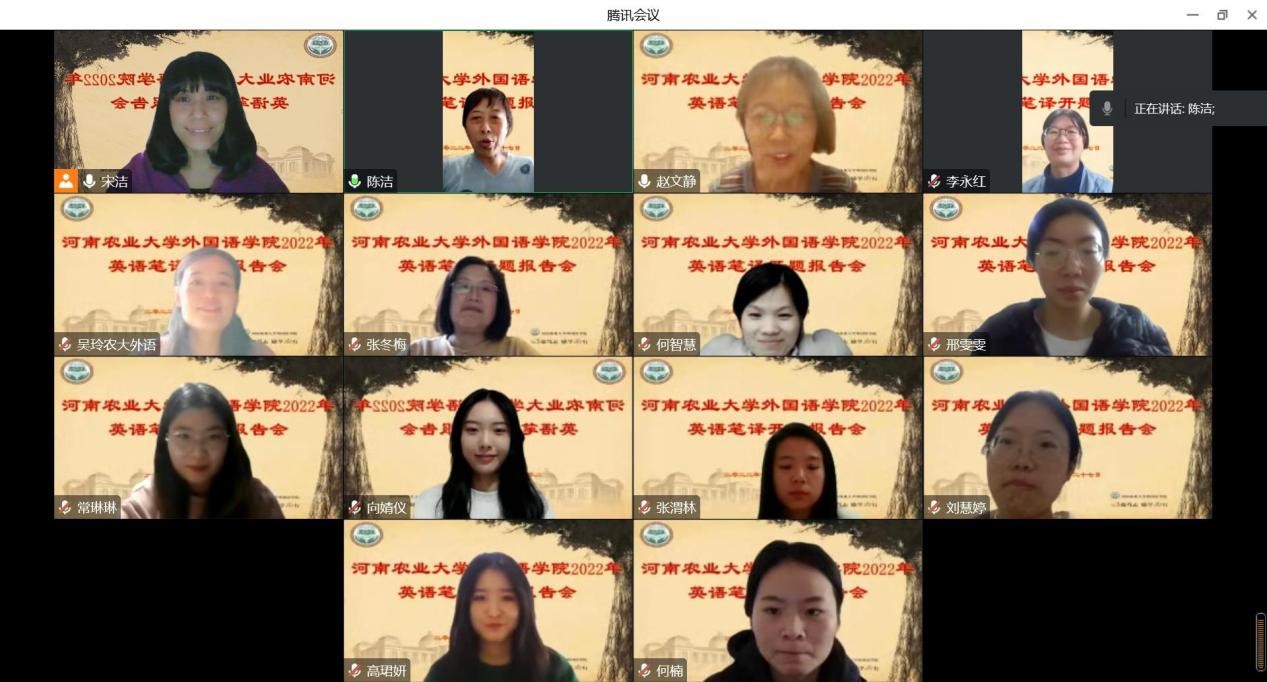 2022年翻译硕士开题报告会采用线上的形式顺利举行。此次开题报告会分成三个组别同时进行,华南农业大学李占喜教授、郑州大学王志伟教授、河南师范大学赵文静教授应邀分别担任主席。成人频道