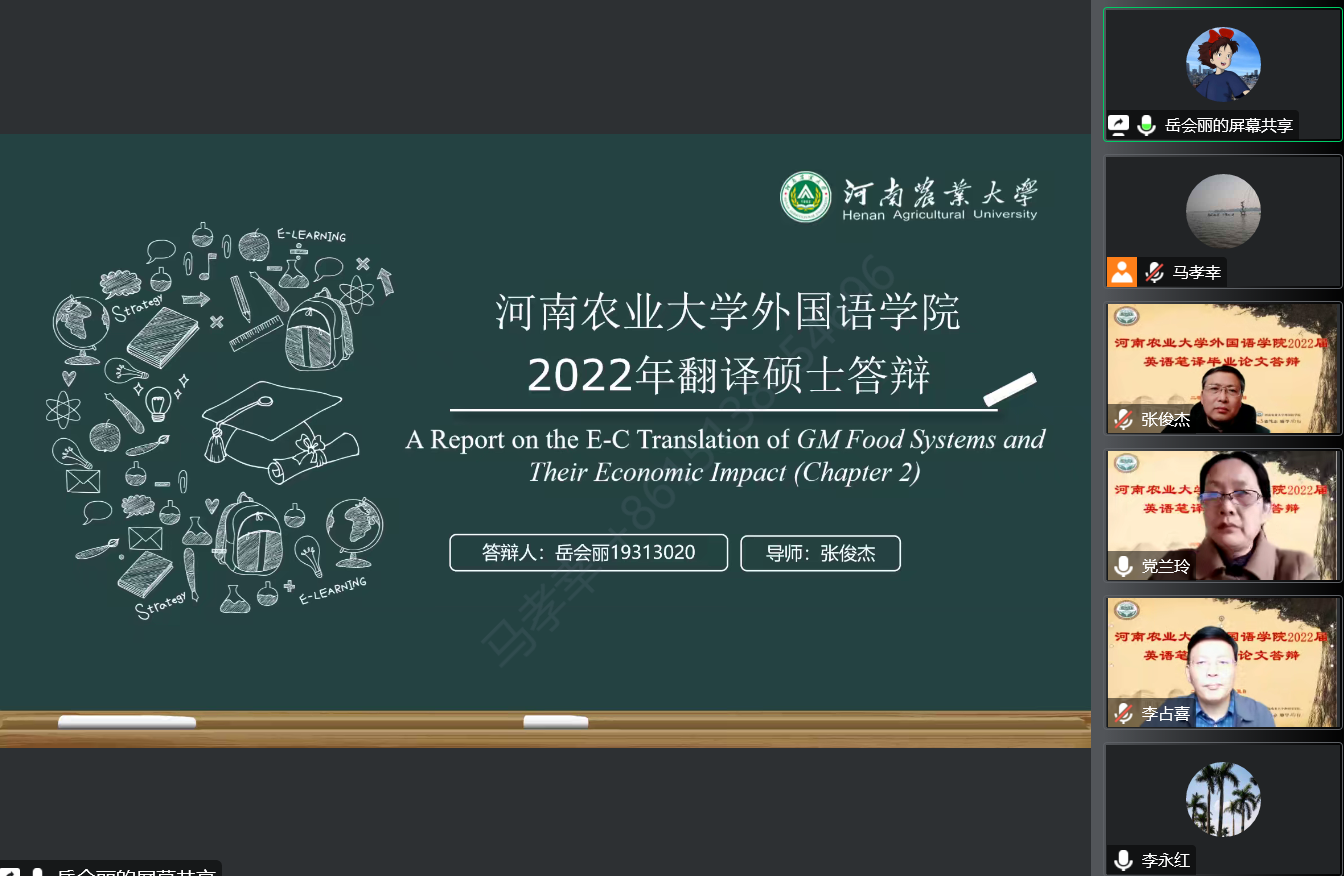 2022届英语笔译专业学位论文答辩通过线上的方式顺利举行。此次答辩特邀华北水利水电大学党兰玲教授担任答辩委员会主席,华南农业大学李占喜教授以及成人频道