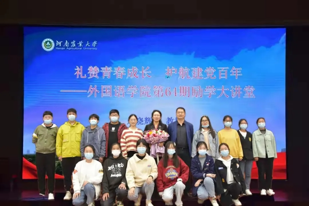 会议伊始,刘晓辉以“幸福是什么”问题引入,结合自身曲折的求学经历分析了自己对幸福的理解,并展示出曾经辛苦求学以及努力工作时的图片。她向同学们强调幸福是奋斗出来的,人生因奋斗而幸福,同学们也通过这些图片更直观地感受到奋斗的不凡意义。接着,她围绕大学新生怎样收获一个美满的大学生活这一主题展开了具体阐述。她指出,首先要对自己上大学的目的有清楚的认知;其次要有学习力,要将本专业的内容学扎实,时刻为身为外语人而感到骄傲;最后要注意情绪管理及调节。在这一部分,刘晓辉引用并具体阐释了适度效应、弹簧效应等心理学名词,从专业角度上给予了同学们如何保持心理健康的建议。在互动环节,现场氛围十分热烈,同学们踊跃发言,向刘晓辉教授咨询了情感、家庭等问题,她也给出了中肯的建议与回答,并希望大家努力成长为有理想、有本领、有担当的社会主义建设者和接班人,书写更加辉煌灿烂的时代华章。会议最后,大家齐唱歌曲《真心英雄》,在振奋人心的歌声中,此次报告会圆满结束。