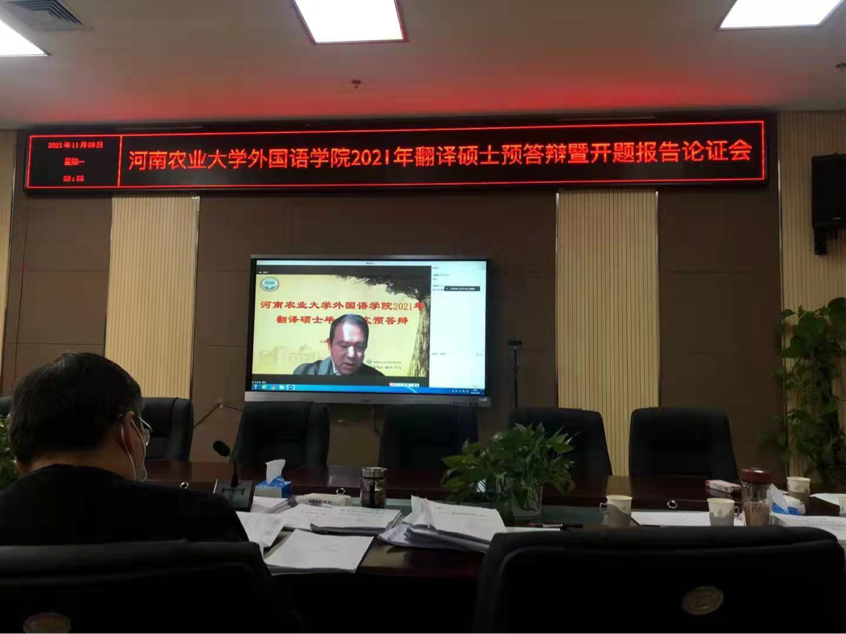 赵文静教授、郑州大学外国语与国际关系学院副院长王志伟教授、校国际合作处处长屠克教授、学院院长张俊杰、李喜芬、 陈洁、李永红等全体硕士生导师担任答辩委员。共有7名学生参与预答辩。2021级全体MTI研究生旁听了本次会议。由于疫情防控,会议主席王志伟教授、主席赵文静教授、豆涛老师进行指导,以及部分学生通过网络会议参与预答辩。