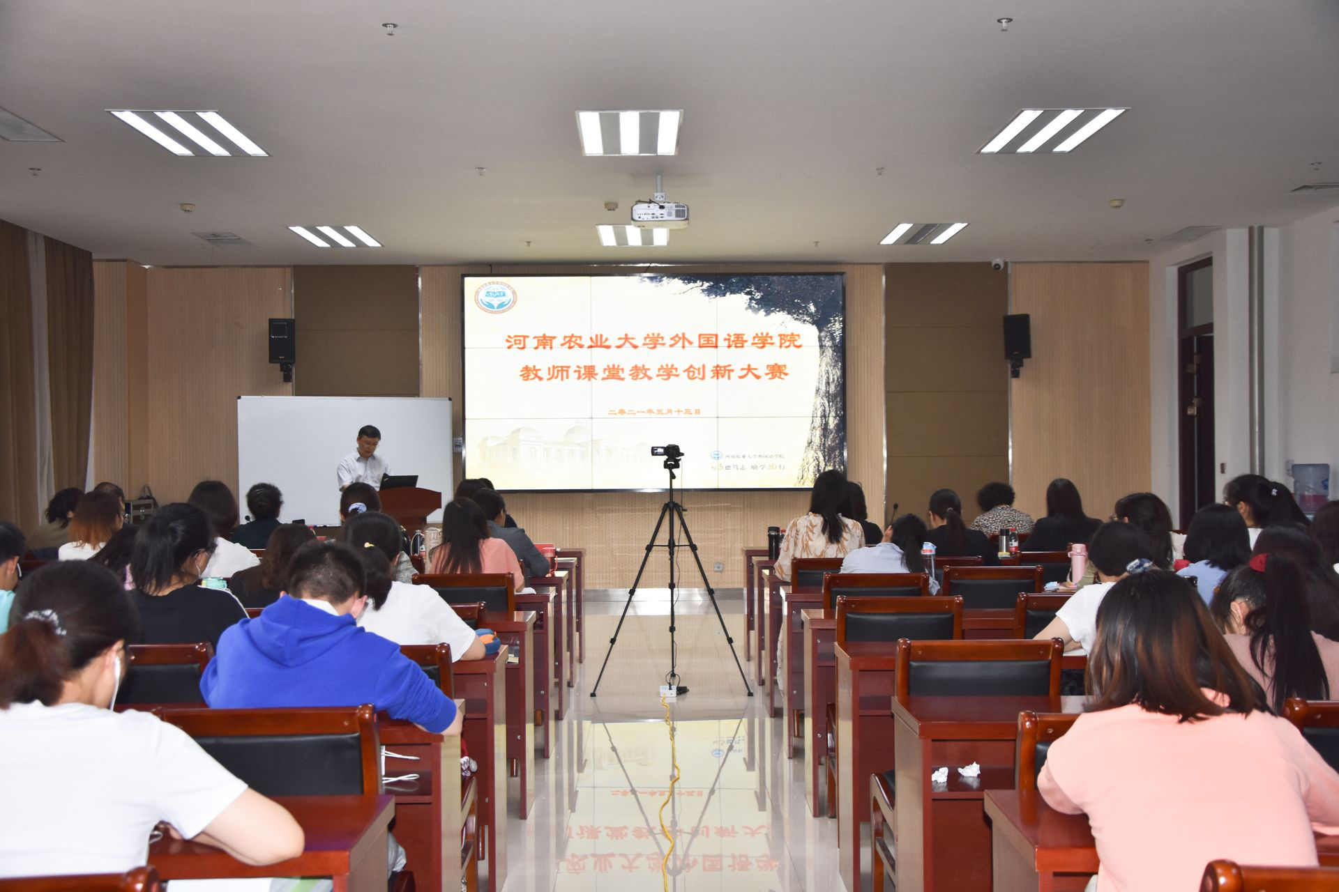 于龙子湖校区繁塔楼A324会议室举办了2021年度教师课堂教学创新大赛。教务处副处长王金铎莅临指导,校教学督导郑笑平,院教学督导张冬梅、罗春凤、院党委书记邓振营以及各系部教授代表组成评委团,学院教工代表观摩比赛,大赛由院长张俊杰主持。
