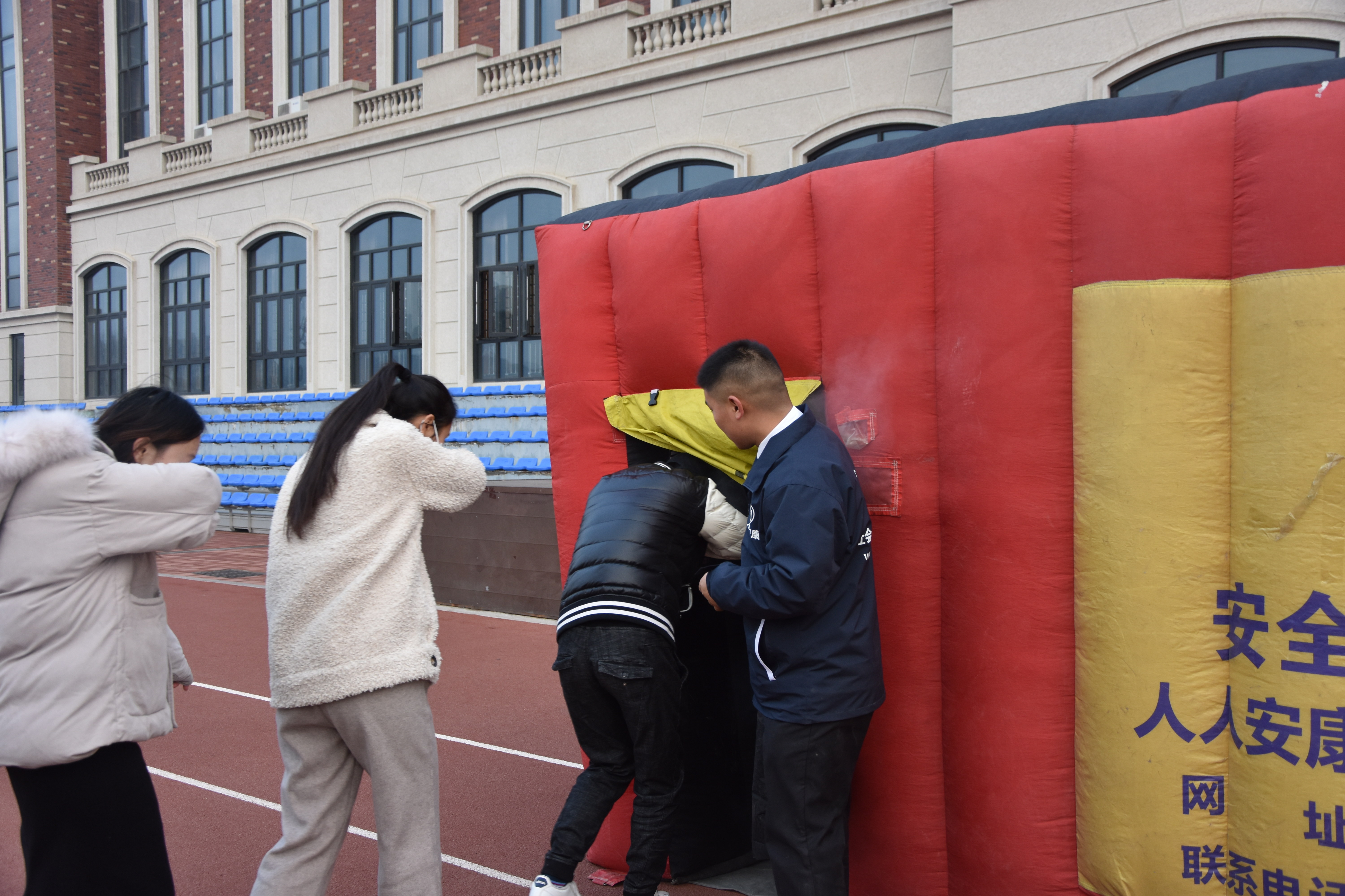邀请到消防协会教员于龙子湖校区田径场开展了消防应急安全疏散逃生演练活动。团委书记李沛带领各班生活委员及寝室长参与此次演练。