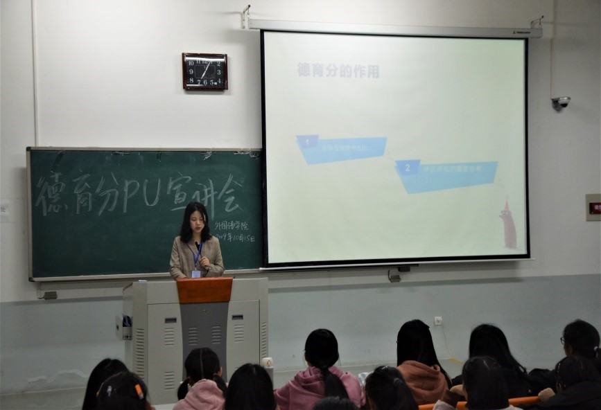 学生个人德育量化管理细则的评分项目、评分等级、评分效用等相关内容进行详细讲解。最后,他呼吁在场学生积极参加各项活动,从中锻炼自我,提升自我,丰富大学生活。