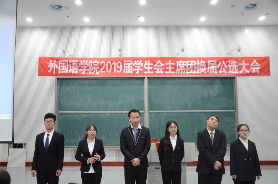 于5月31日晚七点在龙子湖校区繁塔楼AB间四楼大教室举办了2019届学生会主席团换届大会。团委书记李沛、党委组织员邓然、辅导员王颖、闫彬彬携主要学生干部及学生代表出席此次会议。