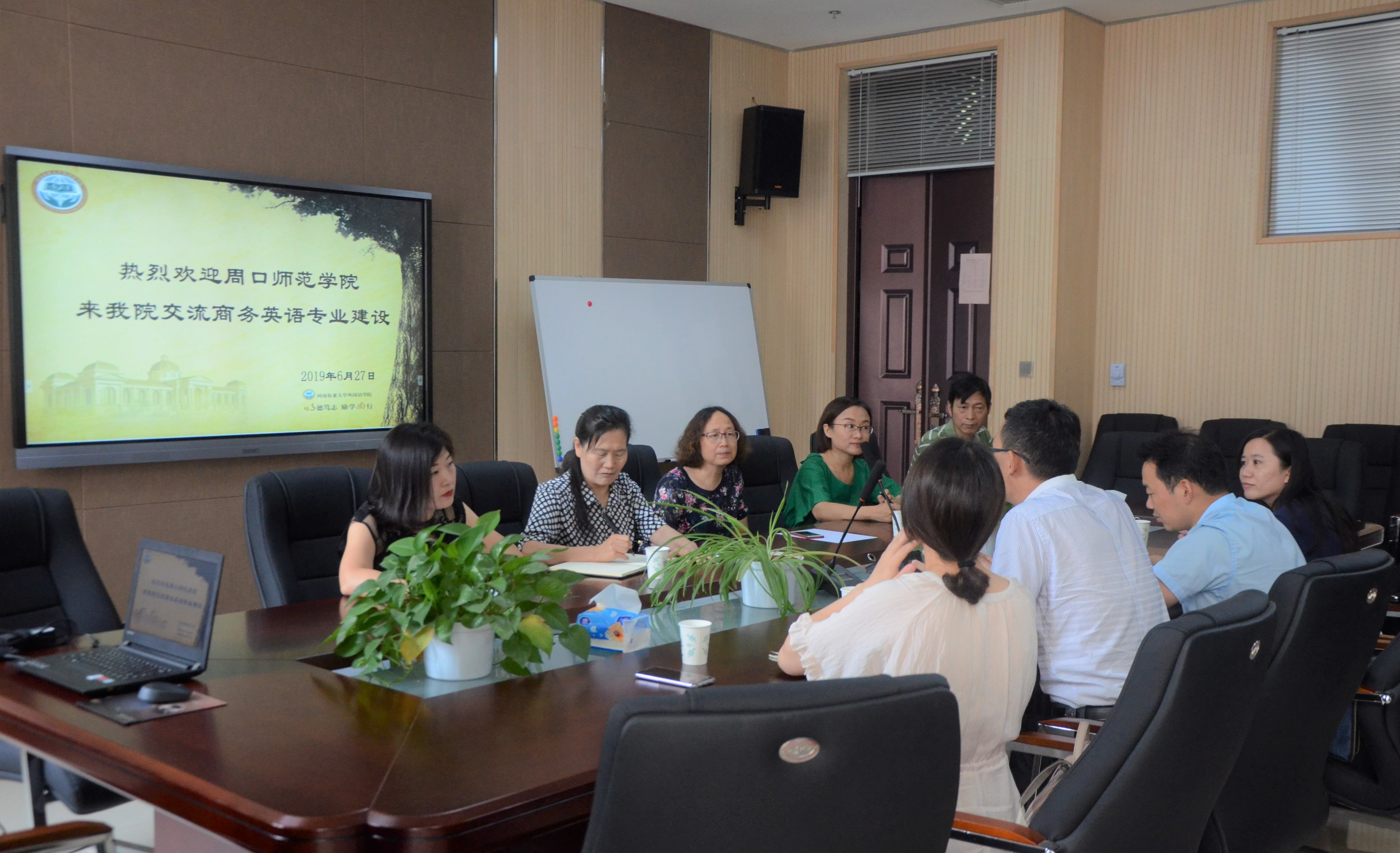 会议伊始,李喜芬对周口师范学院一行的到来表示了热烈欢迎。随后,双方简要介绍各自的办学历程、办学特色、应用型人才培养模式改革以及近年来商务英语专业的发展情况。在聆听彼此珍贵办学经验之后,双方围绕师资力量的培养、商务英语课堂教学、学生语言表达能力的提升等方面展开了热烈的探讨。赵凤玲主任提出申报商务英语专业须按照国家标准来设置课程和学分,才能达到国家认定标准。关于师资力量的培养,赵主任建议可同其它学院进行双向交流合作、积极建设在线开放课程,致力于培养既懂外语又懂经济、商务的复合型外语人才。在商务英语教学方面,柴奇老师表示教学目标不应仅限于使学生熟悉专业术语,还需深入企业开展实践教学,积极发展实践应用型人才。此外,与会人员一致认同语言的交际属性在外语学习中发挥着重要作用,为此,在商务英语教学过程中,不仅要提高学生语言表达能力,还需注重提升学生的跨文化交流能力和商务实践能力。