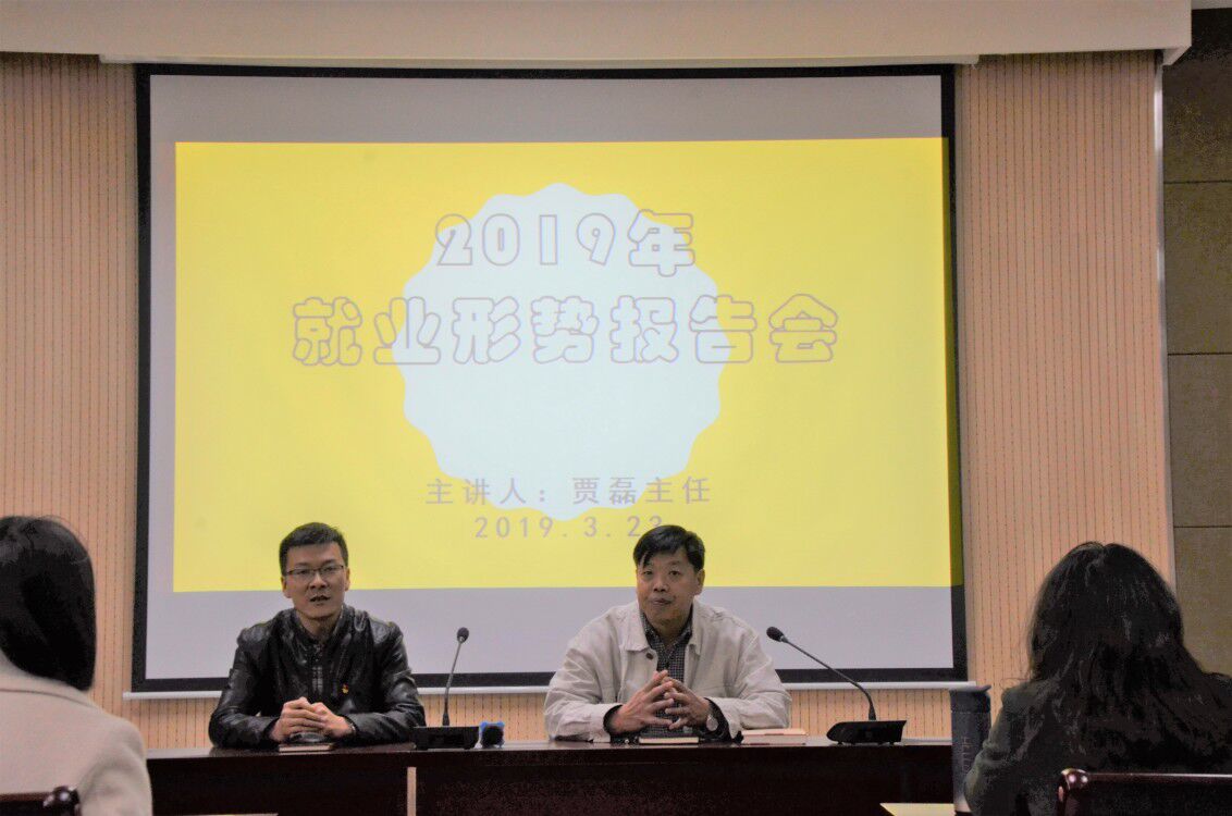特邀校就业指导中心主任贾磊于2019年3月23日下午三点在龙子湖校区繁塔楼A324教室举办就业形势报告会。本次会议由院党委副书记周晓主持,各毕业班学生代表参与了此次会议。
