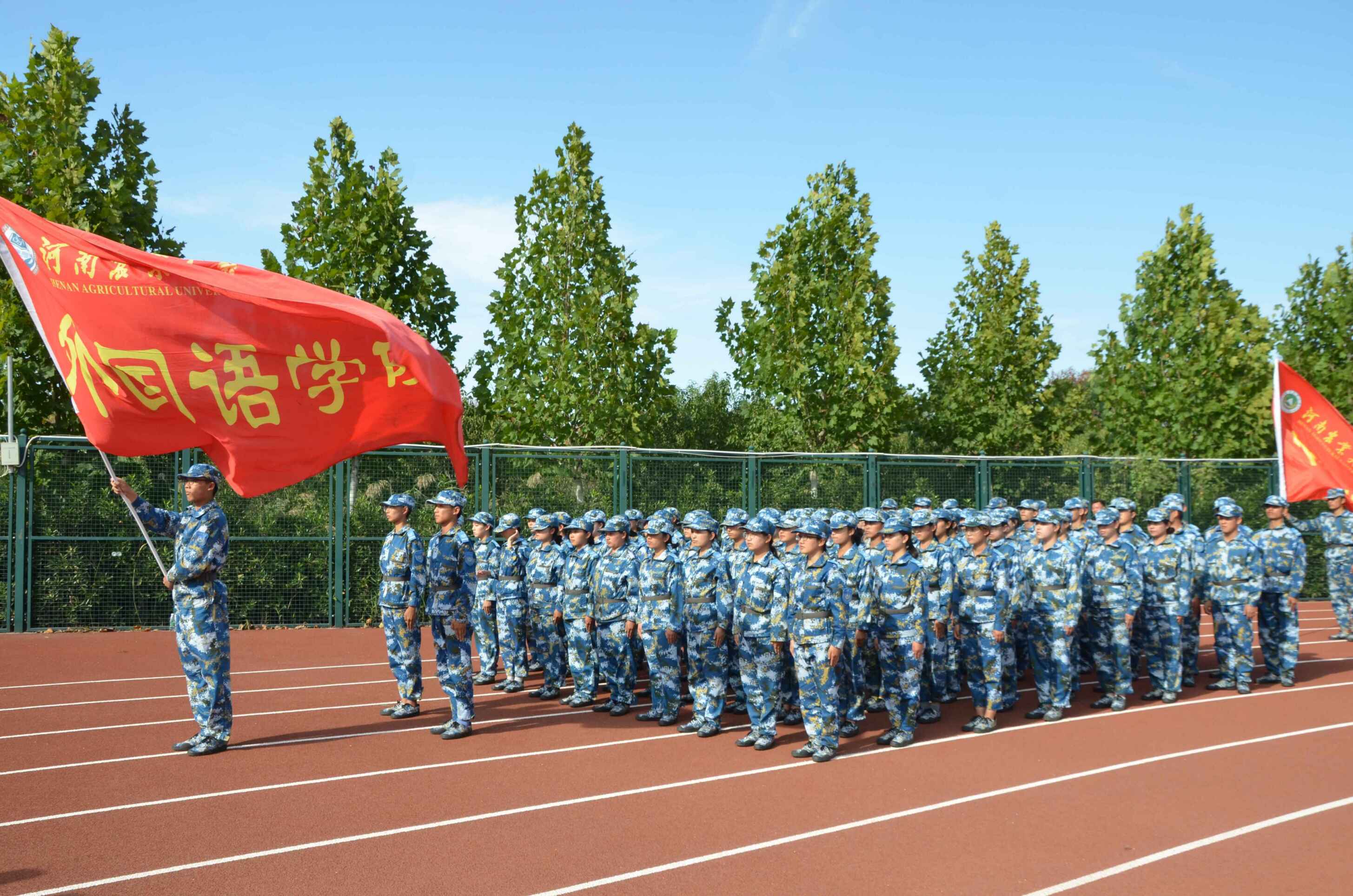 龙子湖校区田径场参加了新生军训会操暨总结表彰大会。