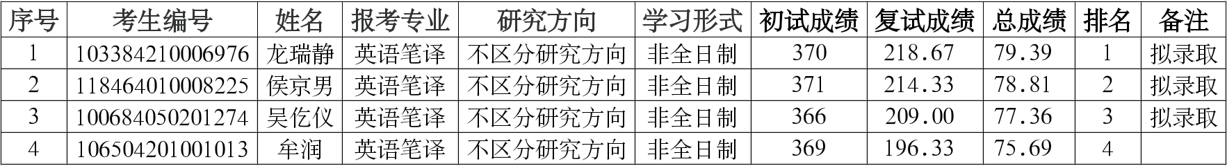 根据学校研究生招生复试工作总体安排,英语笔译非全日制硕士研究生招生计划数增加1人。成人频道 2024年英语笔译非全日制硕士研究生招生第二批调剂考生复试录取工作已经结束,成人频道 第二批调剂志愿复试结果公示如下,公示期至2024年4月21日,请对录取结果进行监督。