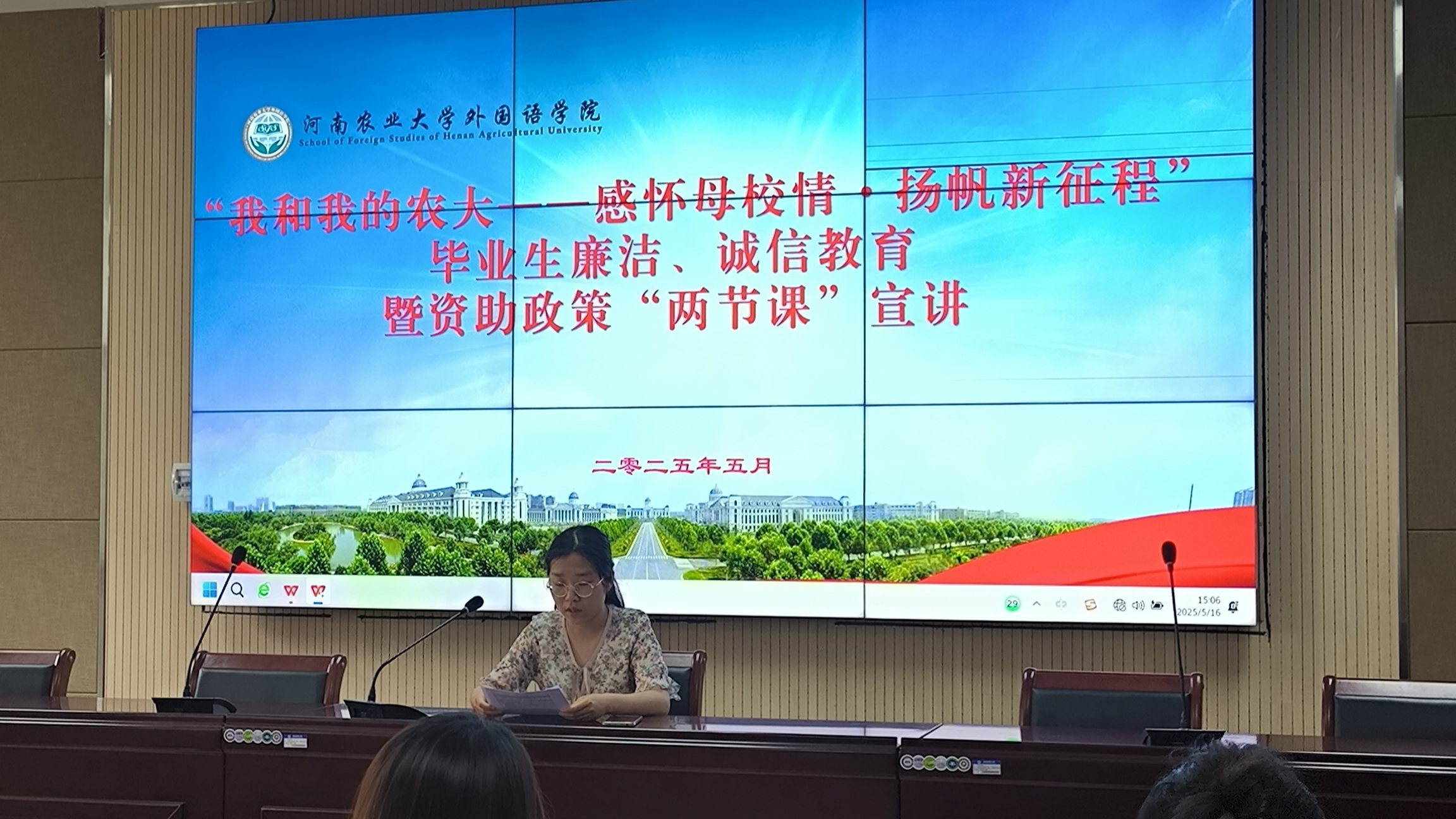 本网讯(审稿:杨鑫 供稿:武宗励 田佳瑶)为进一步做好资助政策宣传工作,着力提升资助育人实效,增强2025届毕业生的信用意识,成人频道 于5月16日在繁塔楼A324开展“我和我的农大——感怀母校情·扬帆新征程”毕业生廉洁、诚信教育暨资助政策“两节课”宣讲活动。本次宣讲活动由辅导员武宗励老师宣讲,2025届毕业生代表参加会议。