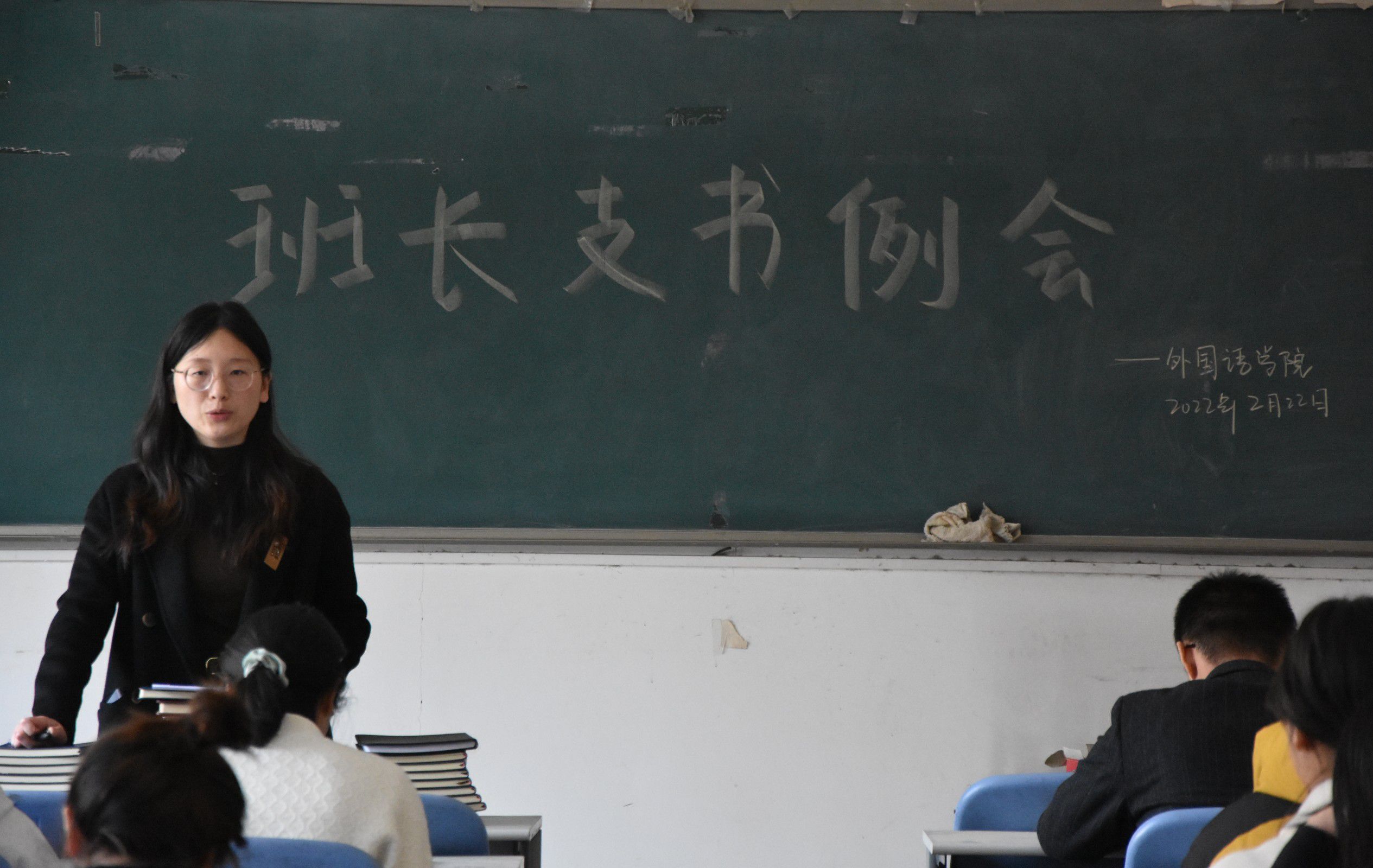 于龙子湖校区海棠园附202自习室召开本学期第二次班长支书例会。团委副书记陈桃、冯超、辅导员穆君怡携主要学生干部和各班班长支书参加此次例会。