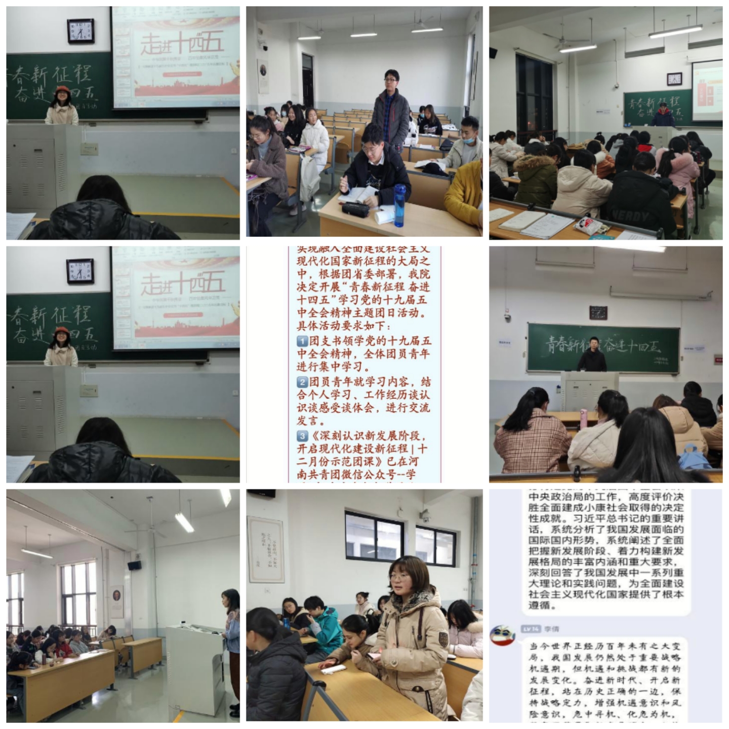 活动伊始,各支部积极组织支部成员观看河南省共青团“深刻认识新发展阶段 开启现代化建设新征程”示范团课,深入了解十九届五中全会的会议内容、重大意义,以及我国在新发展阶段的重要特征、有利条件、战略机遇等。从一年看五年,党和国家取得的历史性成就极为不易、经验极为宝贵;从五年看十五年,全面建设社会主义现代化国家的战略目标鼓舞人心、战略部署催人奋进;为了巩固学习成果,各团支部在团支书的组织和带领下展开了热烈讨论。讨论过程中,同学们畅所欲言、从不同角度发表见解。并纷纷表示要立志向、修品行、练本领,为成长为社会主义现代化国家的建设者时刻准备着;活动结束后,各支部成员纷纷撰写学习感悟,一篇篇内容详实、语言恳切的文章深刻有力地体现出成人频道