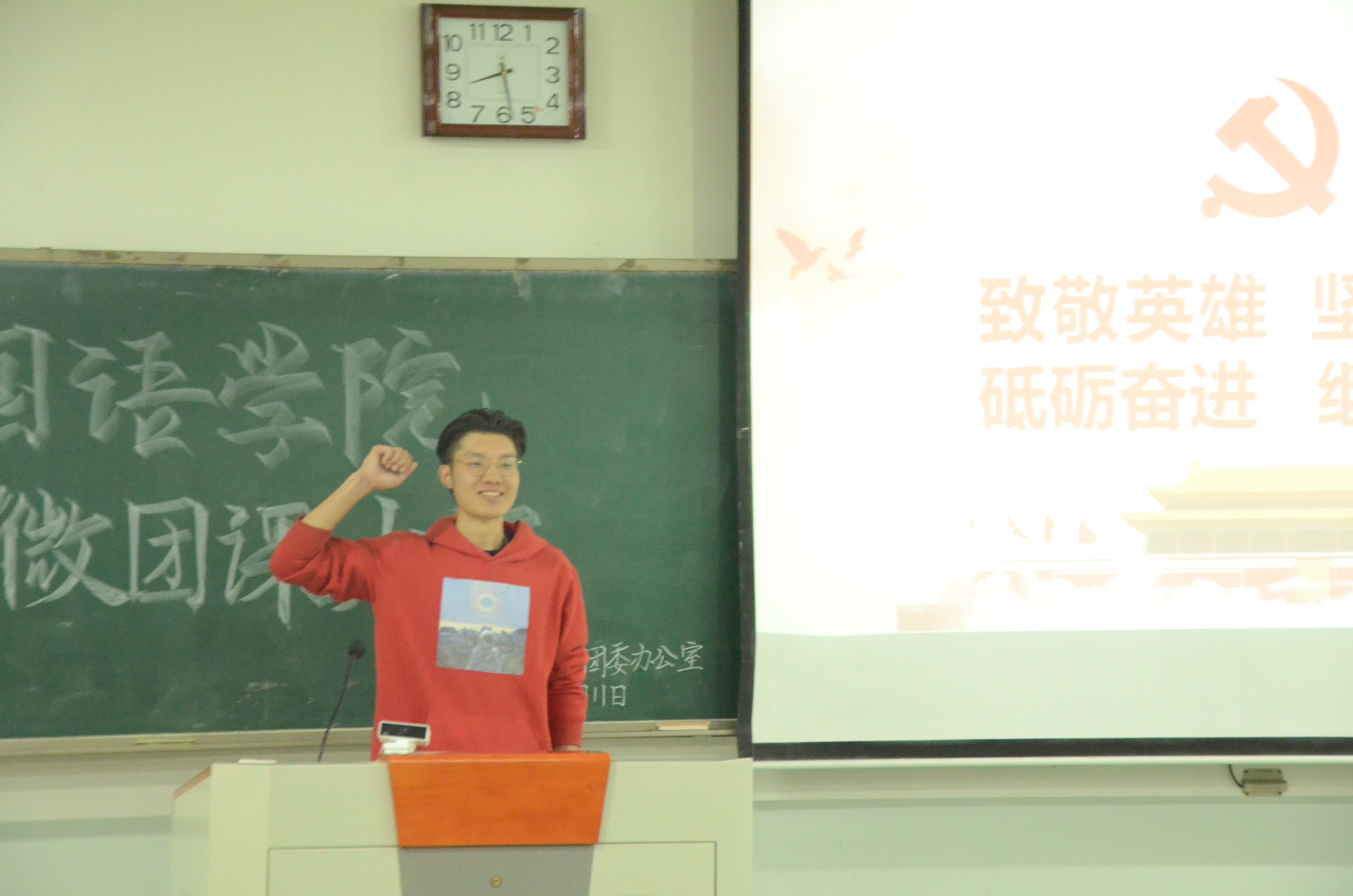 会议伊始,在主持人介绍了此次大赛的主题及评选细则后,比赛正式拉开帷幕。比赛中,各位参赛选手综合运用PPT、视频、案例分析等方式进行6分钟的团课展示,从不同角度出发,结合理论学习与自身实践经验,为大家献上了一场场令人深思、催人奋进的团课。其中,19级英语一班陈甜甜以饱满的激情,洪亮的嗓音为大家解读了“四个精神”,生动诠释了“伟大的时代需要伟大的精神,伟大的精神成就伟大的事业”的精神内涵,赢得了在场观众的阵阵掌声;19级商务英语二班王悦达以脱贫攻坚为主题,声情并茂地讲述了脱贫攻坚战中的河南成绩,呼吁同学们“将自己的命运与民族命运紧密结合起来,让青春在基层中发光发热”;20级英语三班的李文杰则聚焦抗美援朝,带大家重温了那段“埋骨何须桑梓地,人生到处有青山”的峥嵘岁月,他强调,今日的美好生活是无数革命先辈用生命和鲜血换来的,我们要珍惜眼前生活,更要在实际行动中继承发扬伟大革命精神,为实现中华民族的伟大复兴贡献青年力量。各选手给同学带来的生动活泼、内涵丰富的理想信念教育课,收获了现场观众的一阵阵掌声和喝彩,一次次把现场气氛推向高潮。