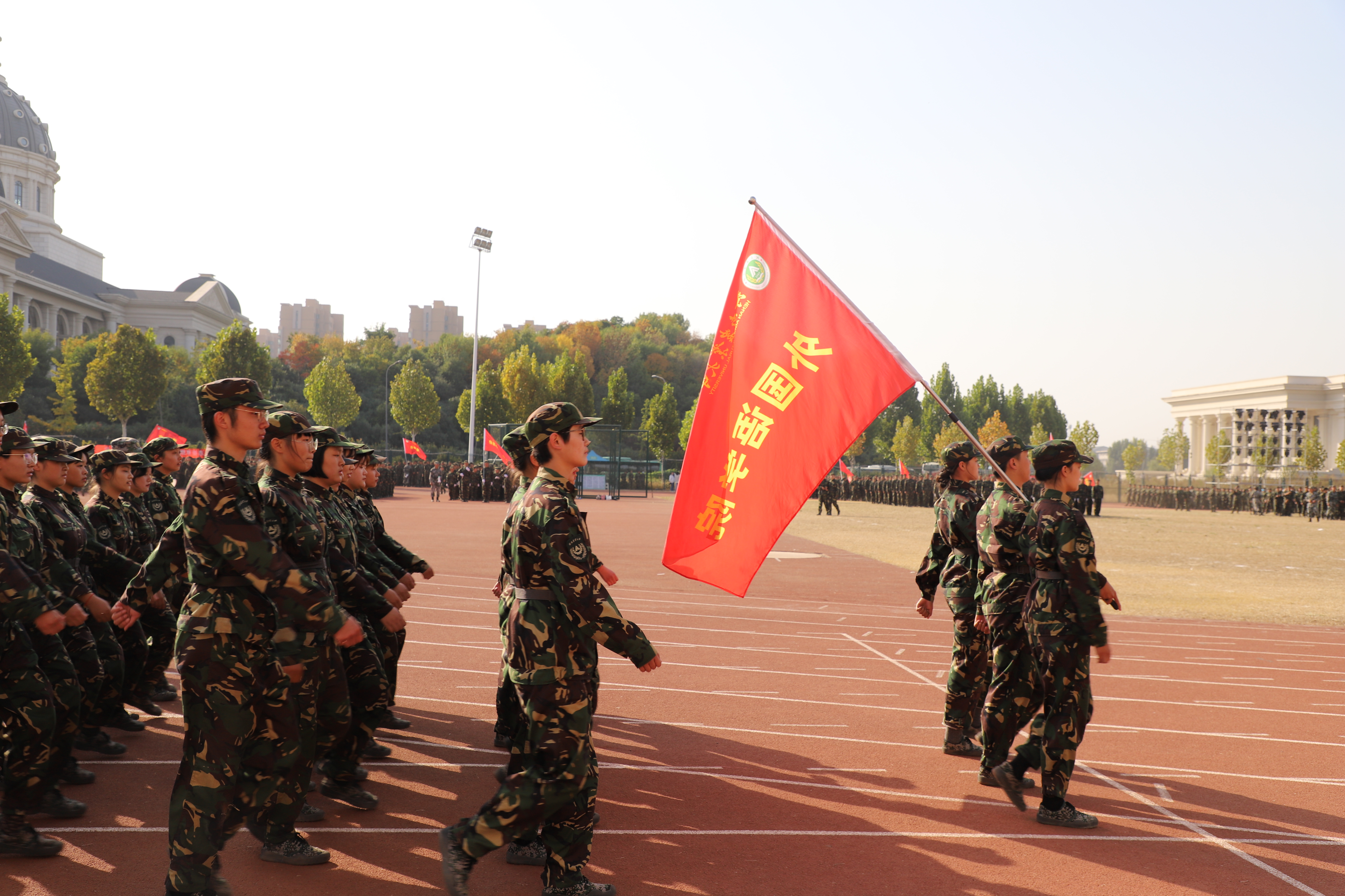 2020级全体师生在龙子湖校区田径场参加新生军训会操暨总结表彰大会。